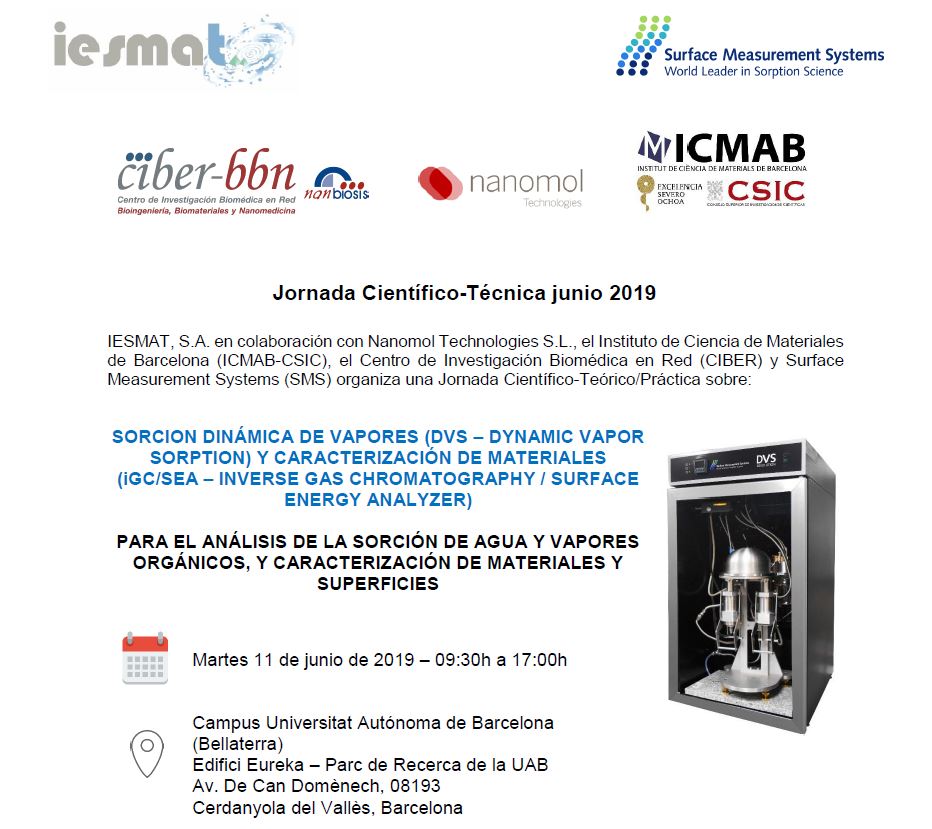 The event is organized by IESMAT, S.A. in collaboration with Nanomol Technologies SL, the Institute of Materials Science of Barcelona (ICMAB-CSIC), Surface Measurement Systems (SMS) and the Center for Biomedical Research in Network (CIBER)/NANBIOSIS, includes theoretical presentation DVS (Dynamic Vapor Sorption) technologies and iGC-SEA (Inverse Gas Chromatography – Surface Energy Analyzer).