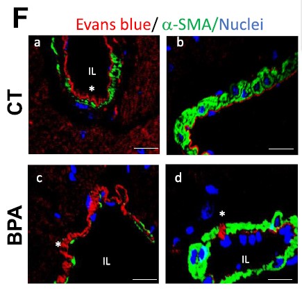 In the picture, F) Representative confocal images from heart sections of CT and 8 weeks treated BPA mice after injection with Evans blue (red fluorescence) followed by immunostaining for α-SMA (green). Nuclei were labeled with Hoechst in blue (n = 4 mice per condition). (a and b) CT hearts sections obtained at different magnifications showed no signs of EB extravasation. (c) and (d) are different sections of coronary arteries of BPA hearts with extravasation areas. Scale bar = 25 μm (a and c) and 50μm (b and d). IL = intraluminal area and (*) marks areas of EB extravasation.