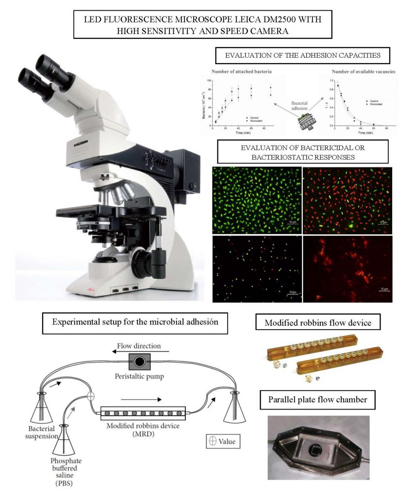 Evaluation of the adhesion of microorganisms to surfaces, including the evaluation of their viability. Adhesion can be studied under flow or static and at different contact times. Study of biolayers formed on materials after different growth times. Evaluation of bactericidal and/or bacteriostatic responses using viability kits or plate growth.