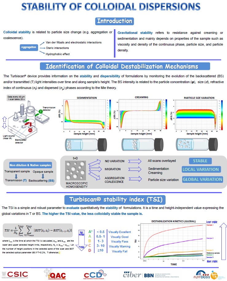 Determination of colloidal stability of emulsions, suspensions and foams. Evaluation of sedimentation, cremation, flocculation and coalescence processes.