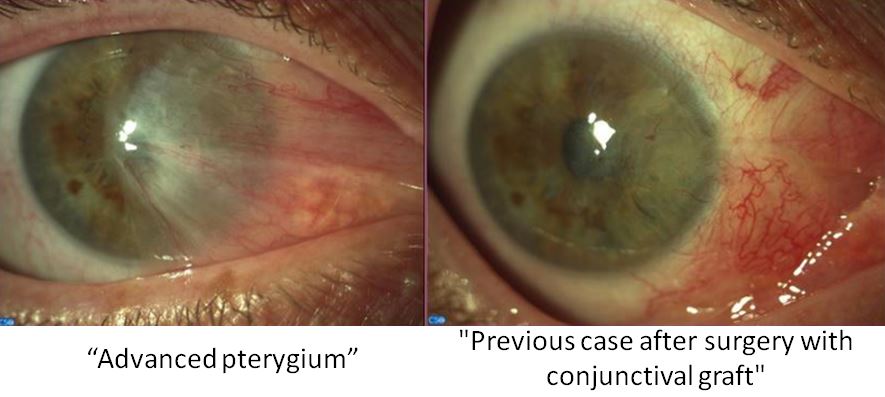 The main cause of pterygium is the lack of lubrication of the eye by the tear film. This lack of lubrication may be due to various external factors such as excessive exposure to sunlight, harsh environmental conditions or even allergens, which causes dryness and subsequent irritation in that area. Pterygium grows in the form of fleshy mass on the cornea, being in these cases the application of surgery to extract it. So far the technique with better results is to place a graft of the conjunctiva of the eye itself in the place of removal of the pterygium, fixed by sutures or tissue adhesives.