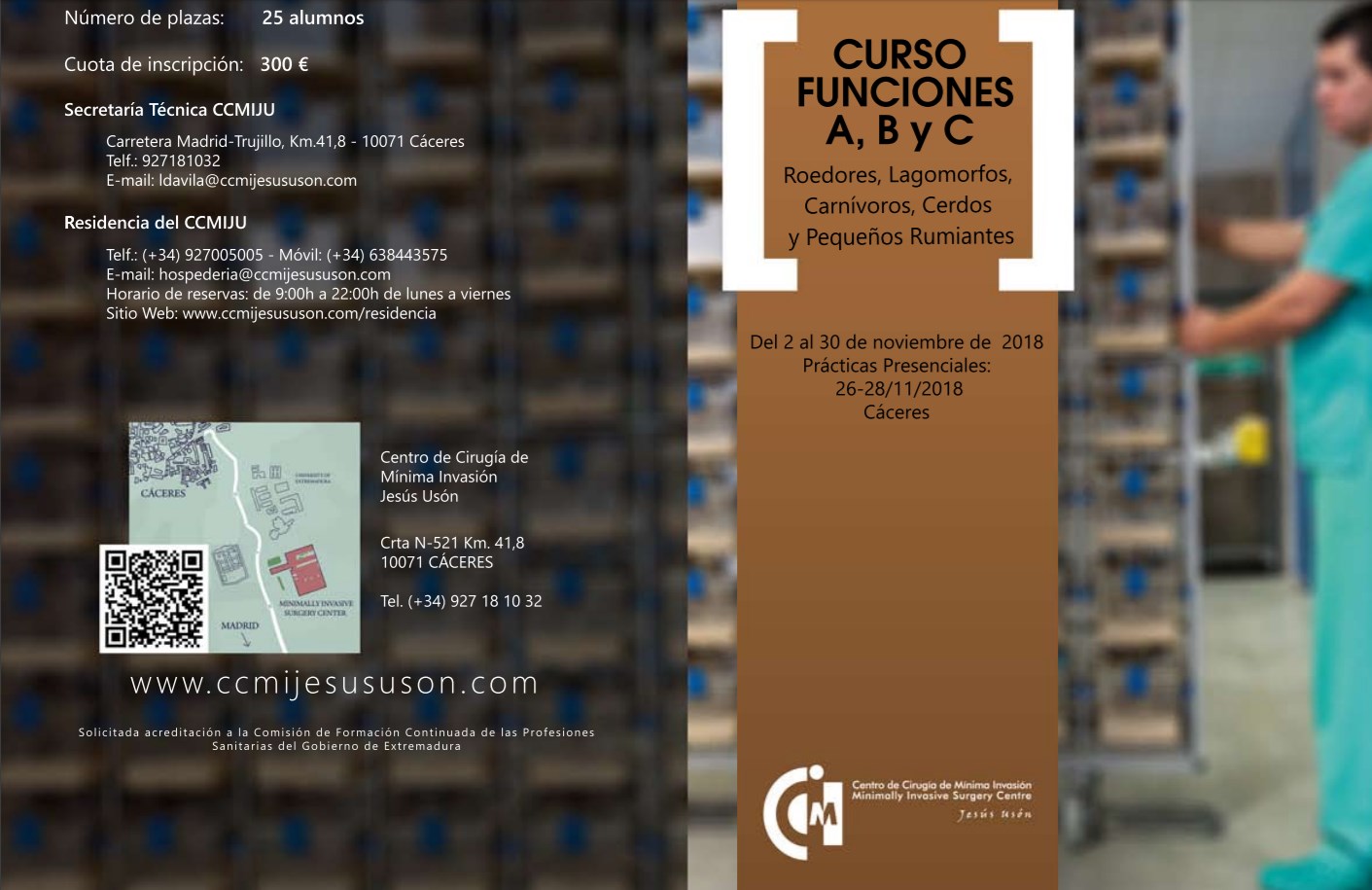 This course, once met all the requirements demanded by the Competent Authority (supervised work period) by the students, will provide accreditation for the performance of FUNCTIONS A (care of animals), B (euthanasia of animals) and C (realization of procedures), granted by the Ministry of Environment and Rural, Agrarian Policies and Territory. These functions correspond to those established in article 15, point 2 letters a), b) and c) of Royal Decree 53/2013, of February 1, which establishes the basic rules applicable for the protection of animals used in experimentation and other scientific purposes, including teaching