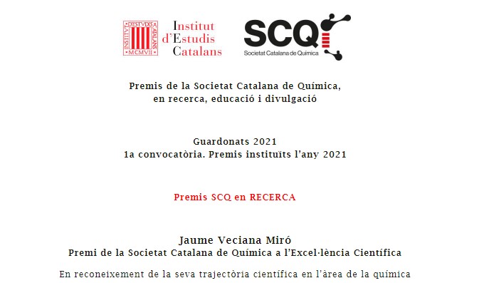 Jaume Veciana Miró, Director of NANBIOSIS, has been awarded by the Catalan Society of Chemistry in its 2021 edition of Awards in research, education and dissemination with the Prize to the Scientific Excellence for his scientific career.