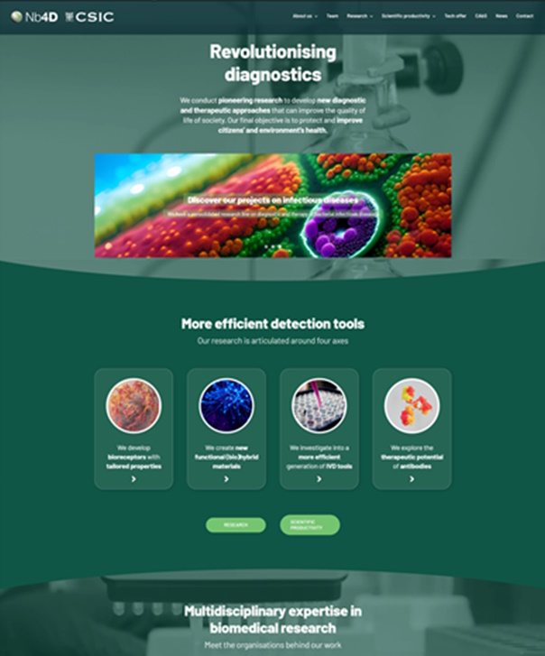 Nb4D has a new look on line! Nb4D Group (of IQAC-CSIC and CIBER-BBN) has lunched a new website “Revolutionsising Diagnosis“ with the aim to facilitate a faster and easier navigation througth their “pioneering research to develop new diagnostic and therapeutic approaches” and their solutions and expertise to help researchers and companies.