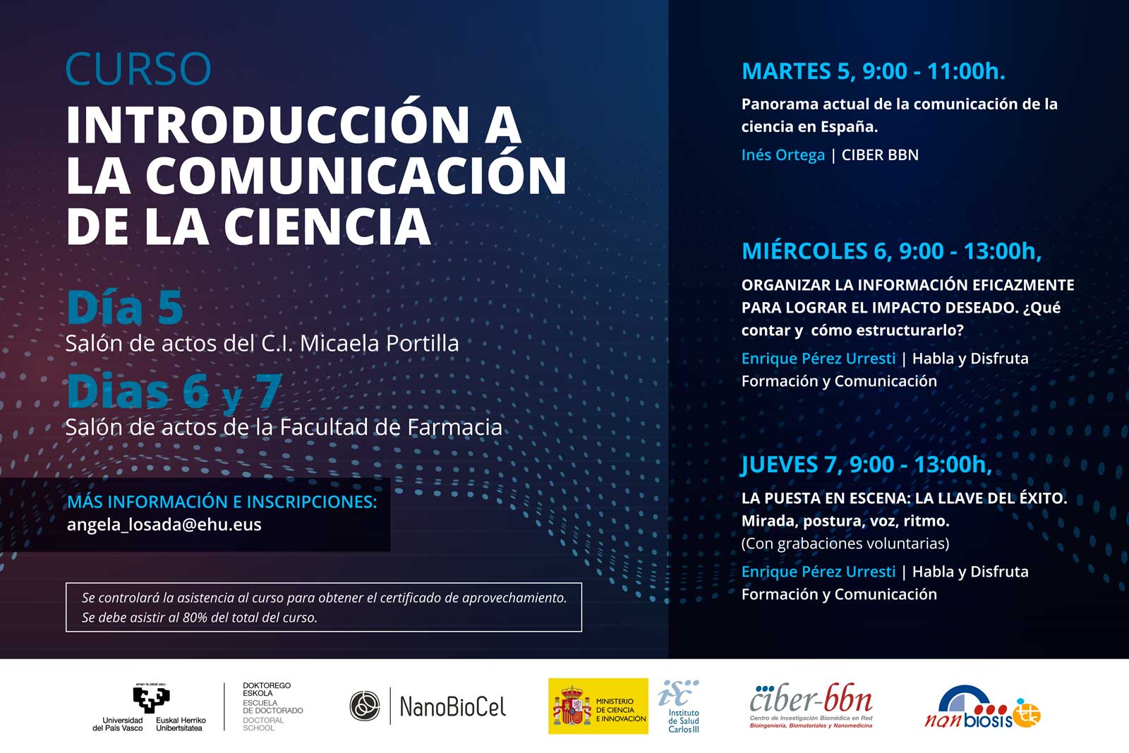 On October 18 and 19, was held the second course on Social Communication of Science, orgnized by NANBIOSIS U10 Drug Formulation Unit -(NanoBioCell Group of CIBER-BBN and UPV-EHU, this year entitled “Tools for the social communication of science“. The course aimed to provide doctoral students with communication with tools to be employed in their work as scientists when communicating their results or activity to the general public, patients, etc.