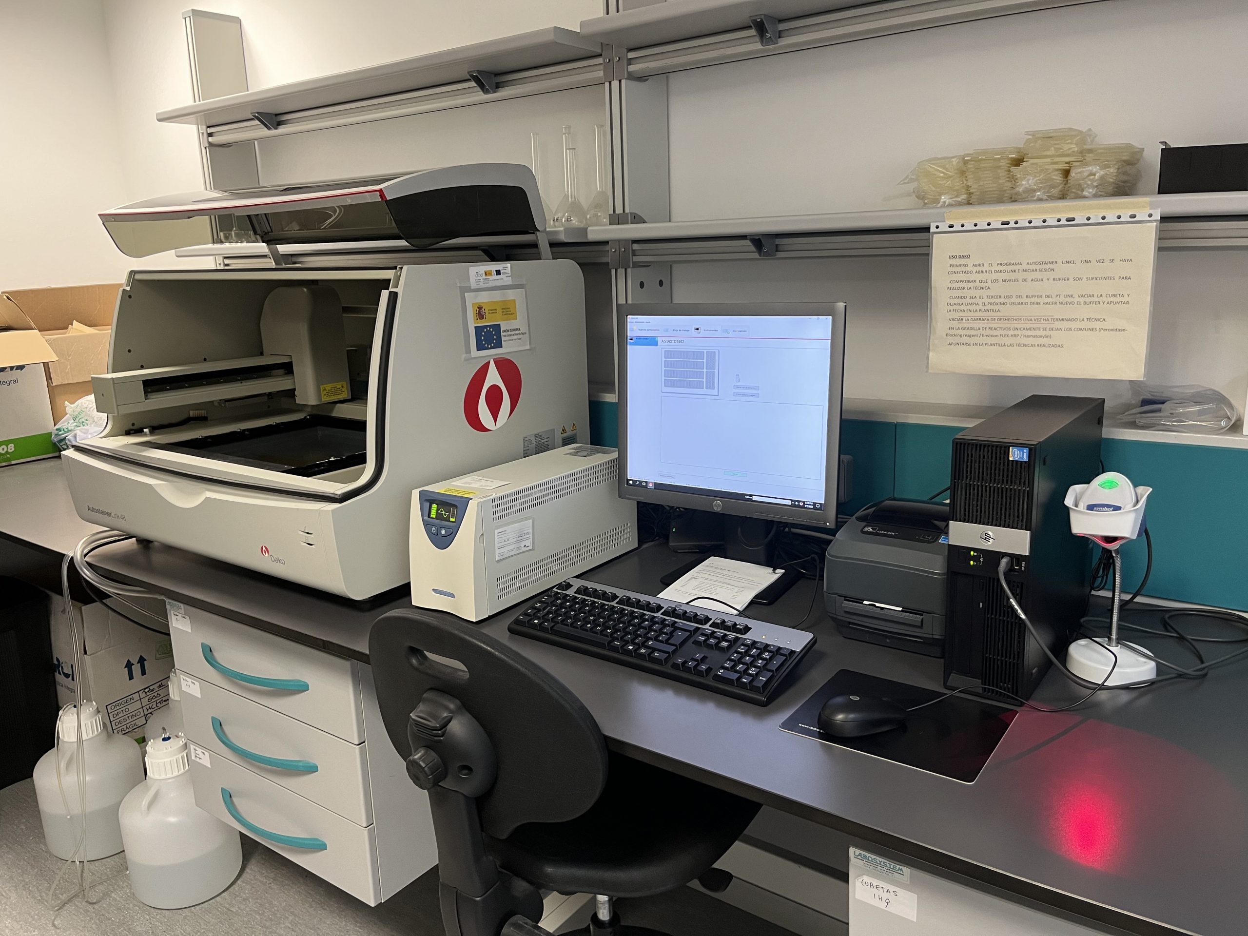 Autostainer equipment for the automation of manual staining methods used in Immunohistochemistry, pharmacodiagnostic, immunofluorescence and chromogenic development for in situ hybridization (AUTOSTAINER-TOX). Includes small equipment for deparaffinization, hydration and antigenic unmasking of paraffin-embedded tissue, complete kit for deparaffinization, hydration and antigenic unmasking of paraffin-embedded tissue. The equipment management software allows monitoring of staining status, request requests, and reporting and obtaining statistics.